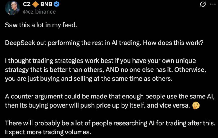 他认为,传统上交易策略通常依赖于独特性,最好是别人没有的策略,这样才能获得优势。如果所有人都用相同的 AI 模型进行交易,可能会导致大家在同一时刻买入或卖出,影响市场动态。