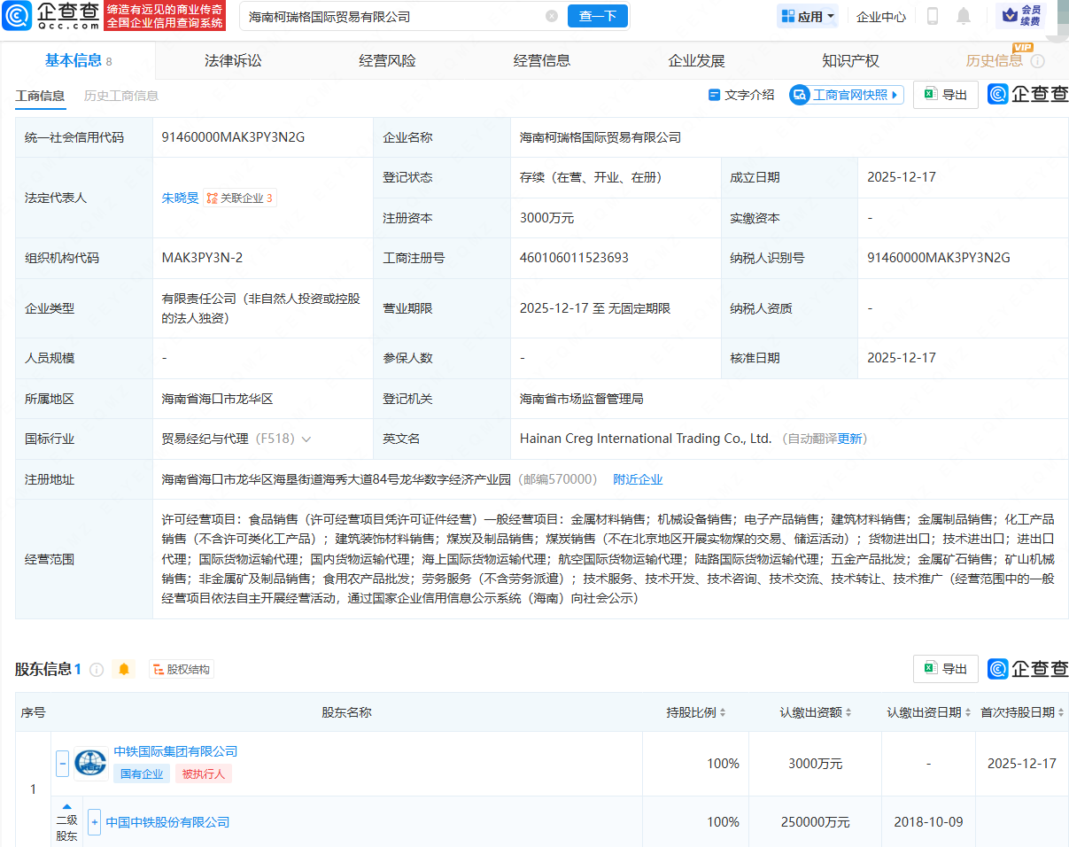 近日,海南柯瑞格国际贸易有限公司成立,法定代表人为朱晓旻,注册资本为3000万元,经营范围包含:金属材料销售;机械设备销售;电子产品销售;建筑材料销售;金属制品销售;国际货物运输代理等。企查查股权穿透显示,该公司由中国中铁(601390)间接全资持股。