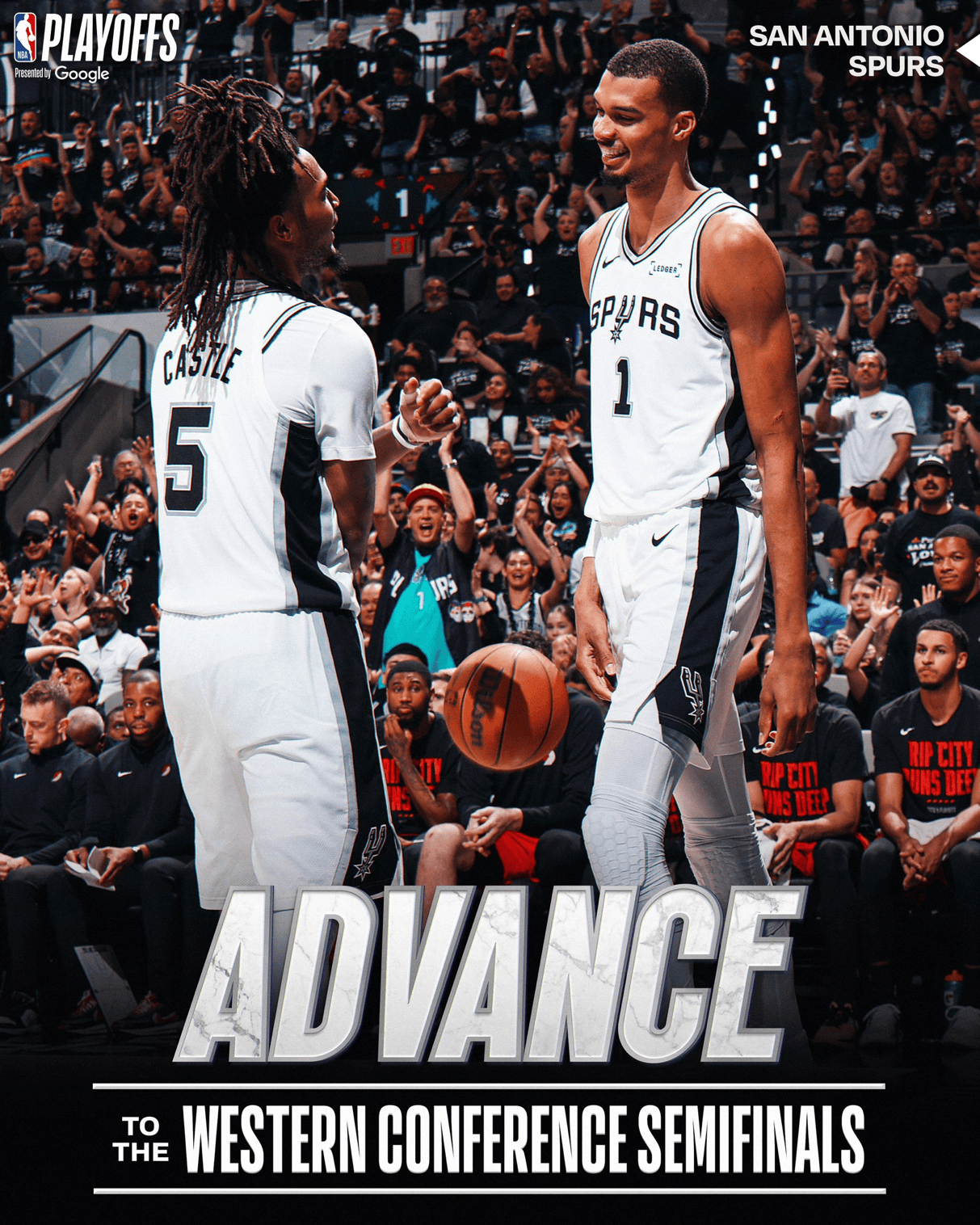 NBA官方晒马刺海报照并附文:“时隔九年!圣安东尼奥马刺队自2017年后首度重返西部半决赛。”